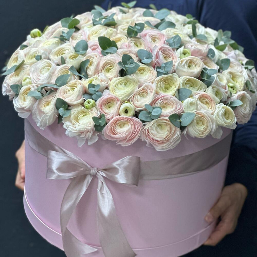 На фото 101 белый ранункулюс в коробке. В составе: ранункулюс 101 шт, оазис флористический 2 шт, шляпная коробка (xl) 1 шт, . Все цветы свежие и ароматные, букет красиво оформлен и отлично подходит для подарка. Доступна доставка цветов или самовывоз.