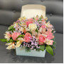 На фото композиция из альстромерии и роз. В составе: роза 5 шт, альстромерия 3 шт, статица 3 шт, аспидистра 2 шт, коробка (s) 1 шт, . Все цветы свежие и ароматные, букет красиво оформлен и отлично подходит для подарка. Доступна доставка цветов или самовывоз.